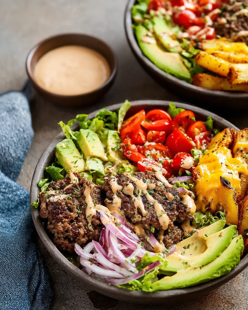 - To assemble the burger bowls, start with a base of lettuce, then add the cooked beef and your desired toppings. Finish with a generous drizzle of the special sauce and enjoy!