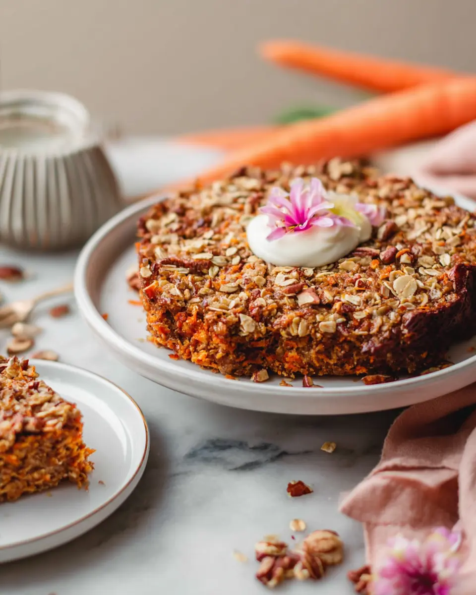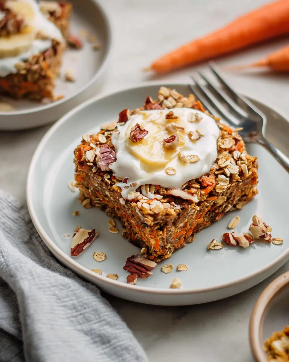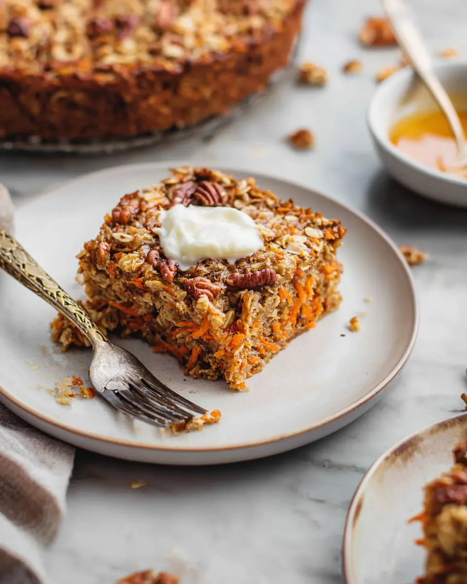 After baking, allow your Carrot Cake Baked Oatmeal to cool for about 10 minutes. This step helps it firm up a bit, making slicing a breeze. Once cool, cut it into 6 hearty squares. If you want to take it to the next level, consider topping it with an optional cream cheese glaze or a spoonful of Greek yogurt. It’s the perfect way to start your day or a great addition to meal prep for those busy mornings ahead!