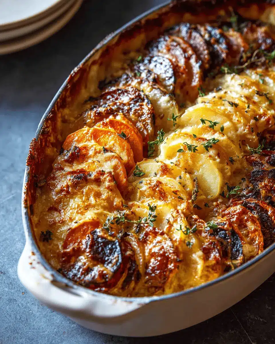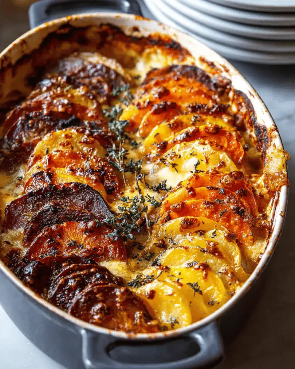 Definitely! For a vegan version of this cheesy root vegetable gratin, substitute the heavy cream with a plant-based option like coconut cream or cashew cream. Instead of Parmesan and Gruyere, try nutritional yeast or vegan cheese alternatives that melt well. These swaps will help maintain that creamy, cheesy goodness while keeping it plant-friendly!