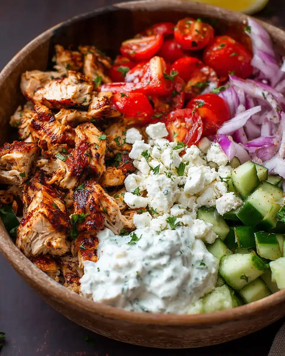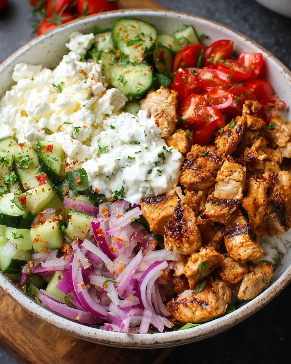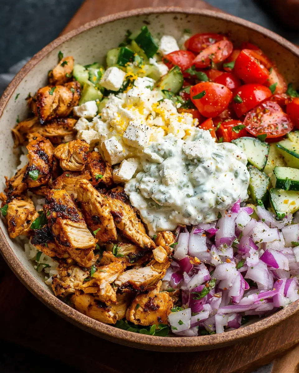 Now comes the fun part! In a bowl, start with a base of fluffy rice or quinoa—both options are great for soaking up those delicious flavors. Layer your cooked chicken on top, followed by the vibrant toppings. Drizzle with your homemade tzatziki sauce or a simple vinaigrette, and don’t forget to sprinkle some extra feta on top for that creamy finish.