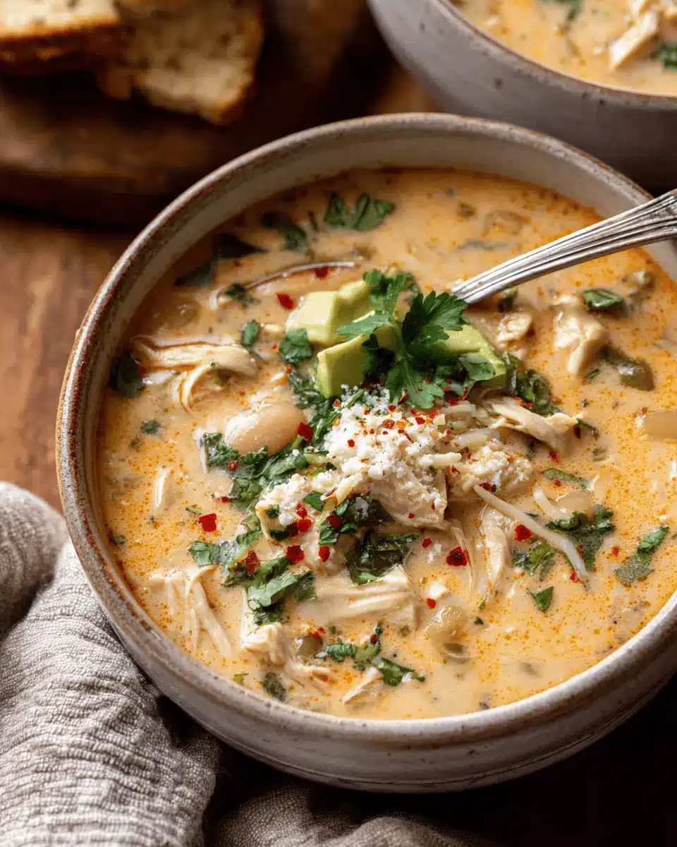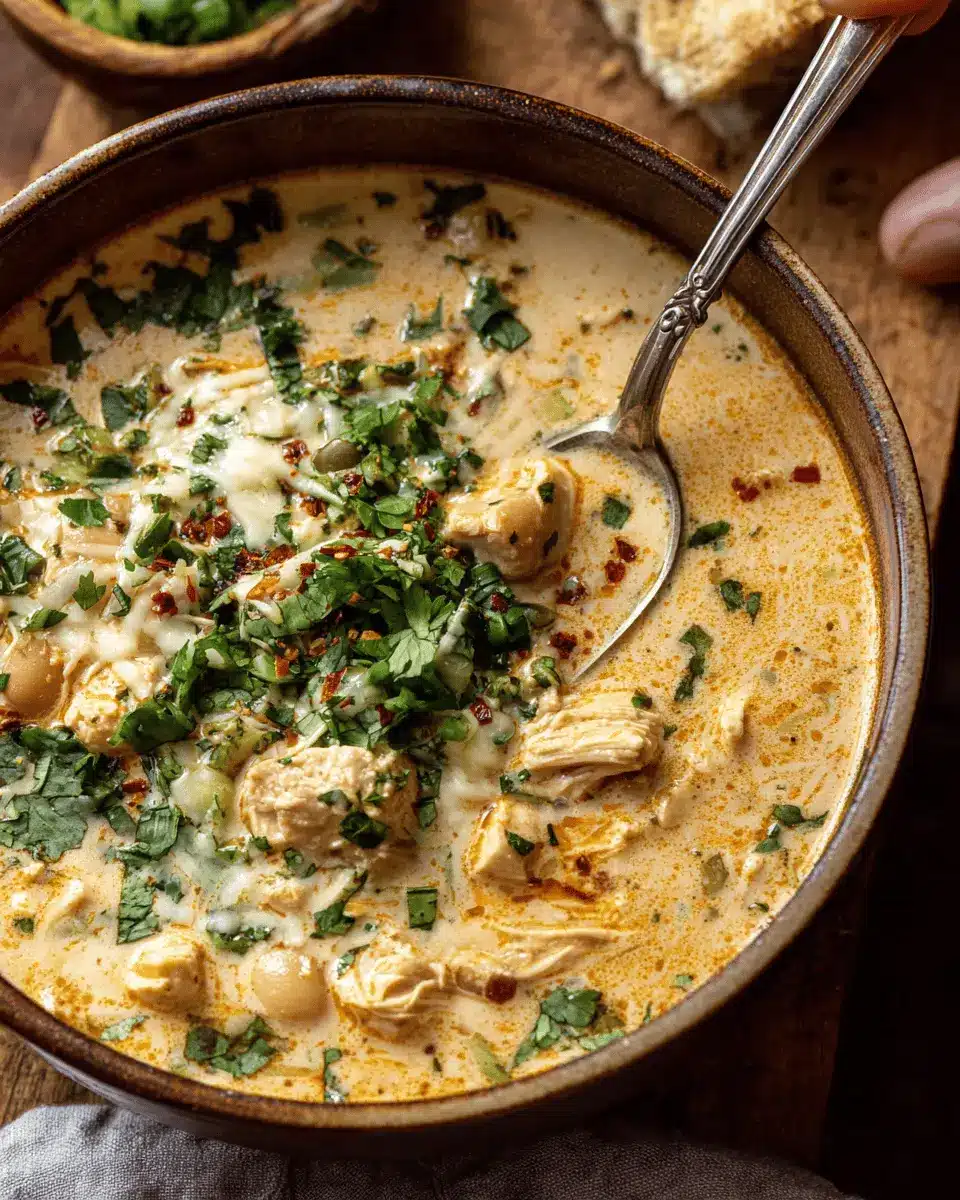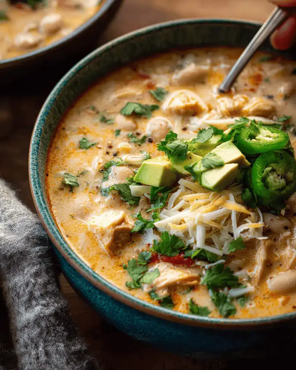 Remove the pot from heat and fold in the chopped cilantro. Ladle the creamy white chicken chili into bowls and finish it off with your choice of optional toppings: maybe a dollop of yogurt or sour cream, some diced avocado, and a sprinkle of extra cheese. A zest of lime can elevate the flavor even more.