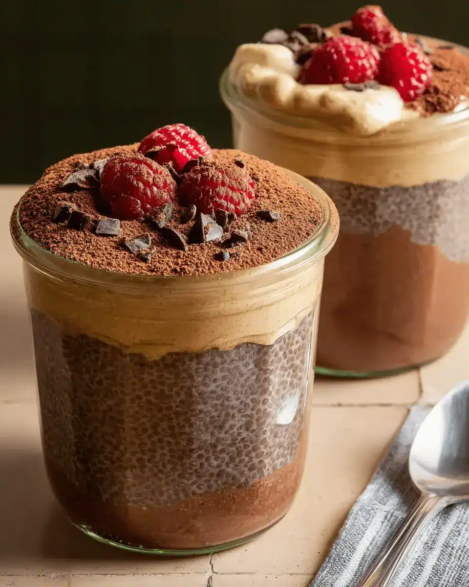 Next, take that luscious peanut butter mousse and spoon about a quarter cup over each serving of chia pudding. For a finishing touch, give the pudding a light dusting of cocoa powder on top.