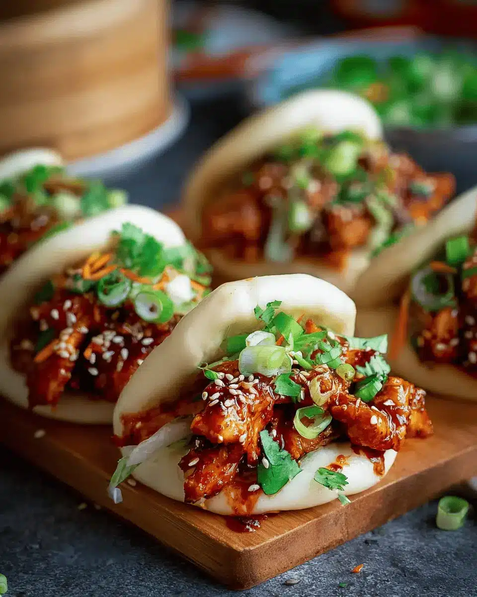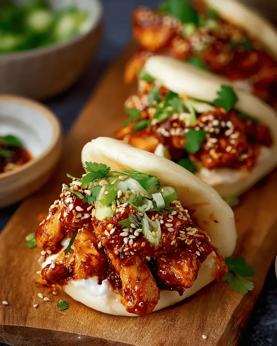 To make your Korean Chicken Bao truly stand out, consider arranging them on a rustic wooden board or a slate platter. Use small bowls to hold the sauces and toppings, creating a visually appealing spread. For an extra touch, garnish with edible flowers or vibrant herbs like cilantro and mint — they not only look great but add to the fresh flavors of the dish.