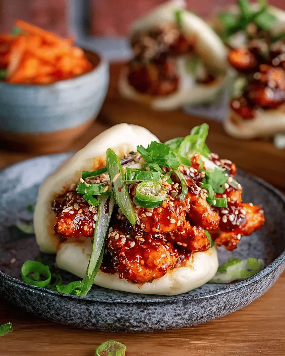 These fluffy bao buns complement a variety of sides. For a refreshing contrast, serve with quick-pickled vegetables or a vibrant Asian slaw. Pairing your bao with a light cucumber salad adds a satisfying crunch and balances the rich flavors of the crispy chicken. Feel free to sip on a flavorful coconut-infused sparkling water or a fruity herbal tea, which complements the dish's unique Korean flavors beautifully.