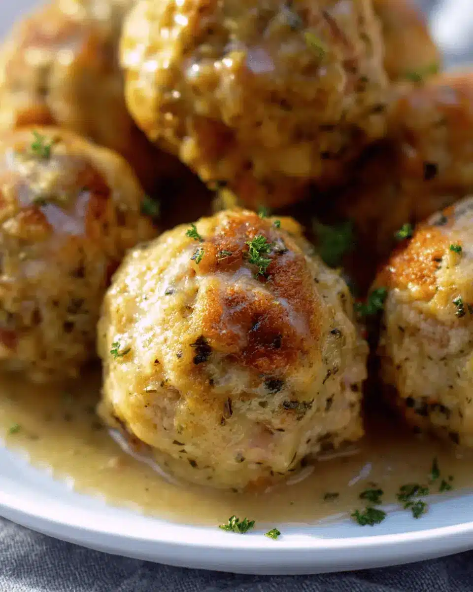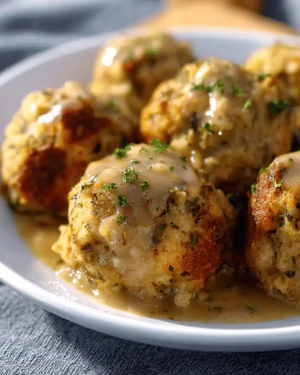 When your leftover turkey stuffing balls are done, remove them from the oven and plate them up! Top with a generous ladle of hot gravy to enhance the flavor. This will not only elevate your dish but also bring a touch of nostalgia from your Thanksgiving feast.