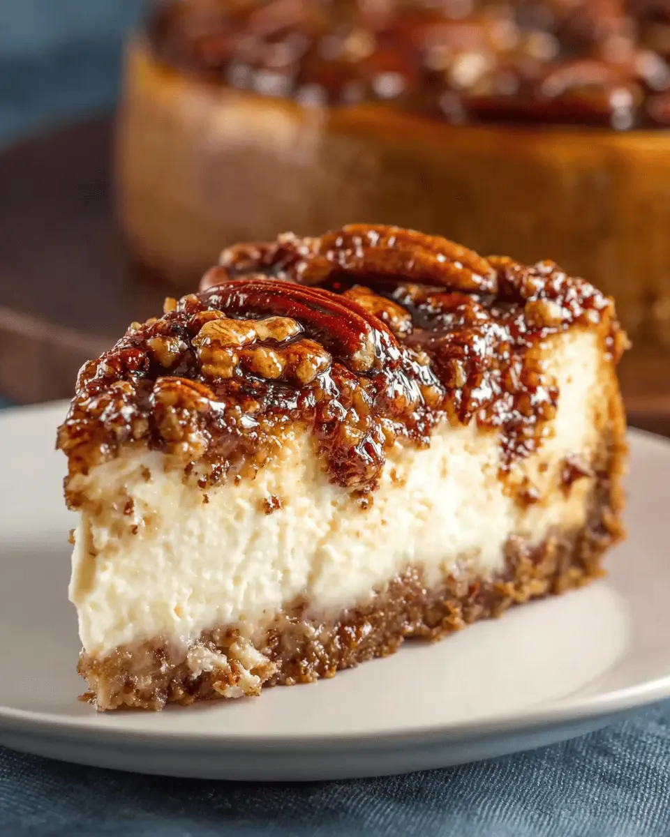 Absolutely! Pecan Pie Cheesecake can be made ahead, which makes it perfect for gatherings. After baking and chilling it for at least 4 hours, it will stay fresh in your refrigerator for up to 4 days. If you want to store it longer, it can also be frozen for up to 2 months. Just be sure to slice the cheesecake before freezing, allowing for easy thawing later on.