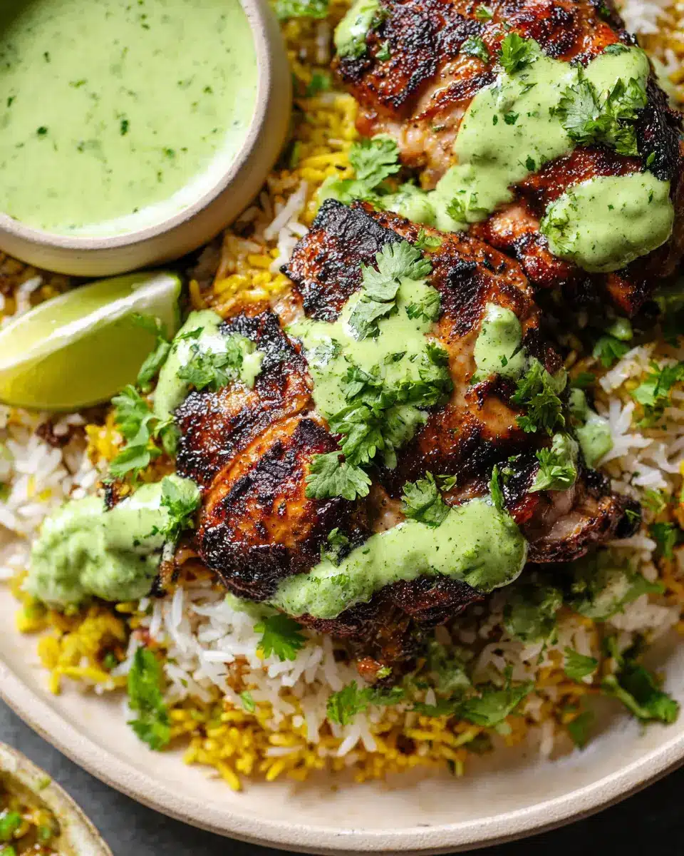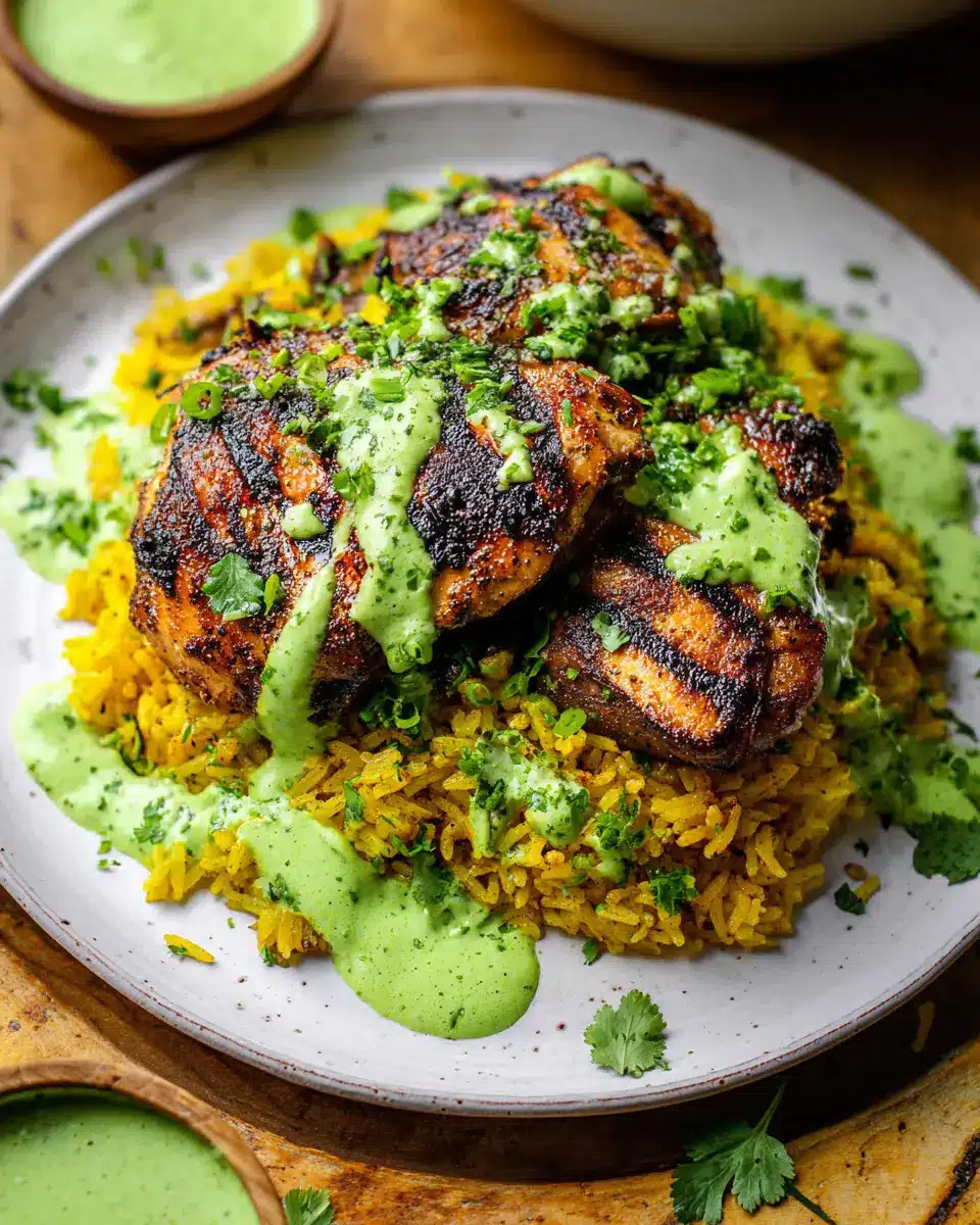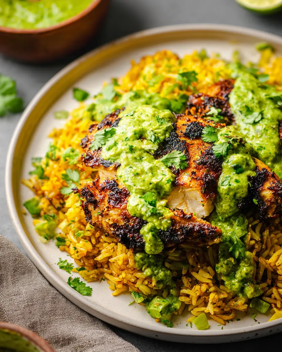 - Divide rice mixture into serving plates, top with grilled chicken and a drizzle of the green sauce. Enjoy!