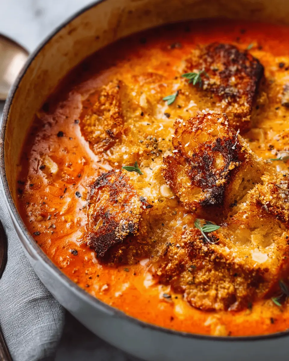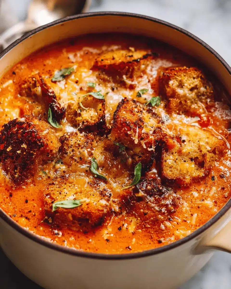 Roasted Tomato Soup with Cheesy Crouton Topper