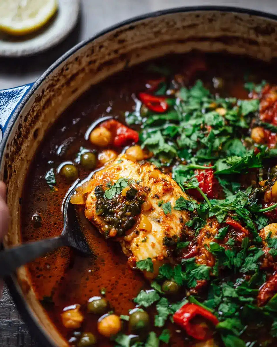 Carefully lift the fillets and serve them on plates adorned with the rich sauce and chickpeas. Garnish with extra fresh cilantro for a pop of color and enjoy this spicy Moroccan fish stew with some bread or rice to soak up that delightful sauce!