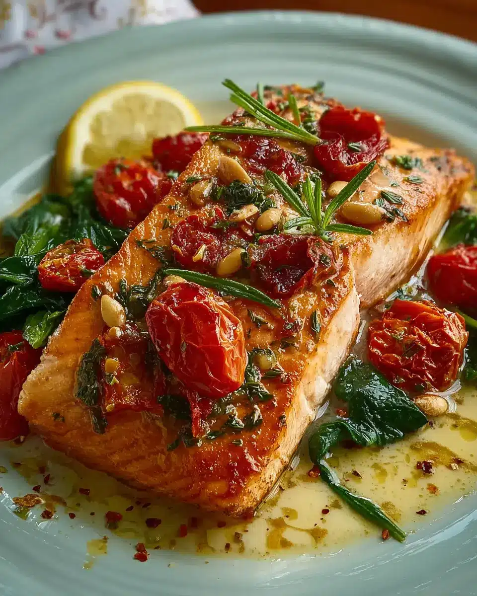 - Serve salmon on a bed of vegetables and sauce, and drizzle with a little olive oil. Garnish with lemon slices, fresh rosemary sprigs, and toasted pine nuts, if desired.